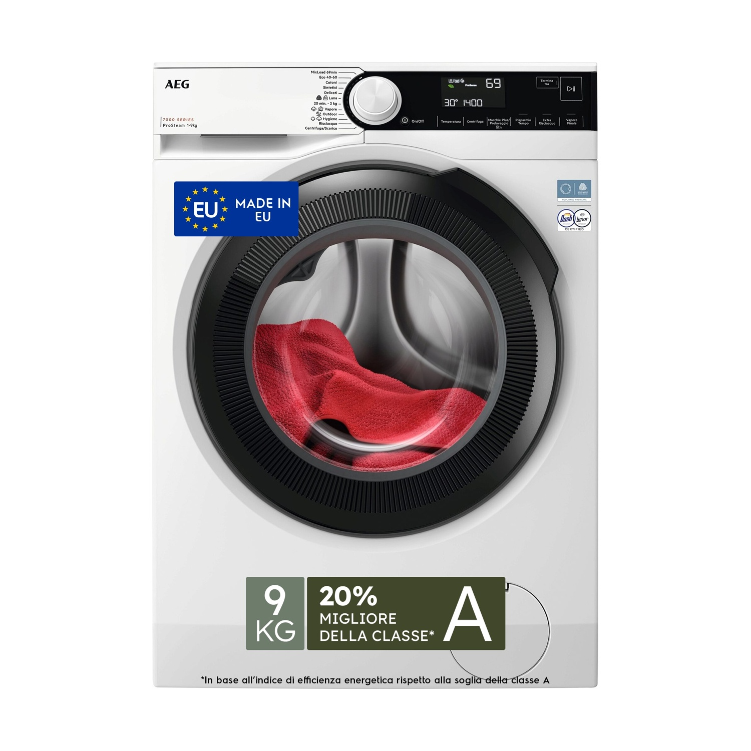 AEG LR7FH94VY LAVATRICE, Caricamento frontale, 9 kg, 12 programmi, Profondità 57,2 cm, Bianco, livello rumorosità centrifuga 72 dB(A), Classe A