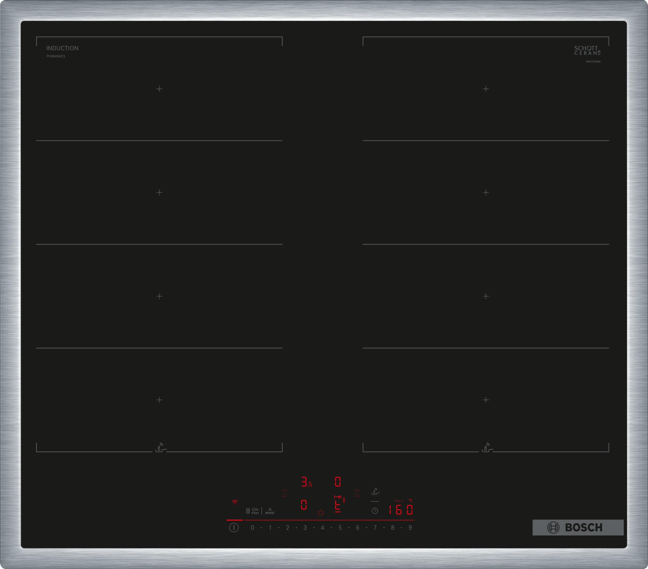BOSCH Serie 6 PXX645HC1E PIANO COTTURA A INDUZIONE, 4 zone di cotura, dimensioni: L 583 mm, P 513 mm, piano in Vetroceramica, Nero