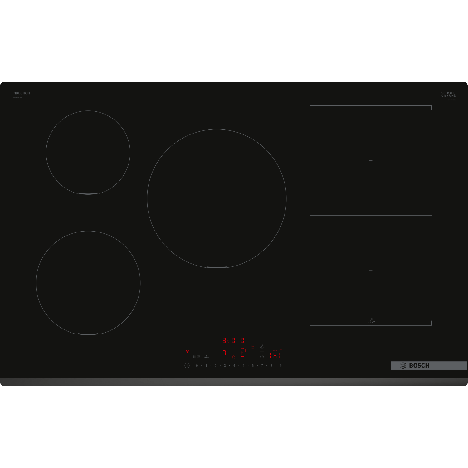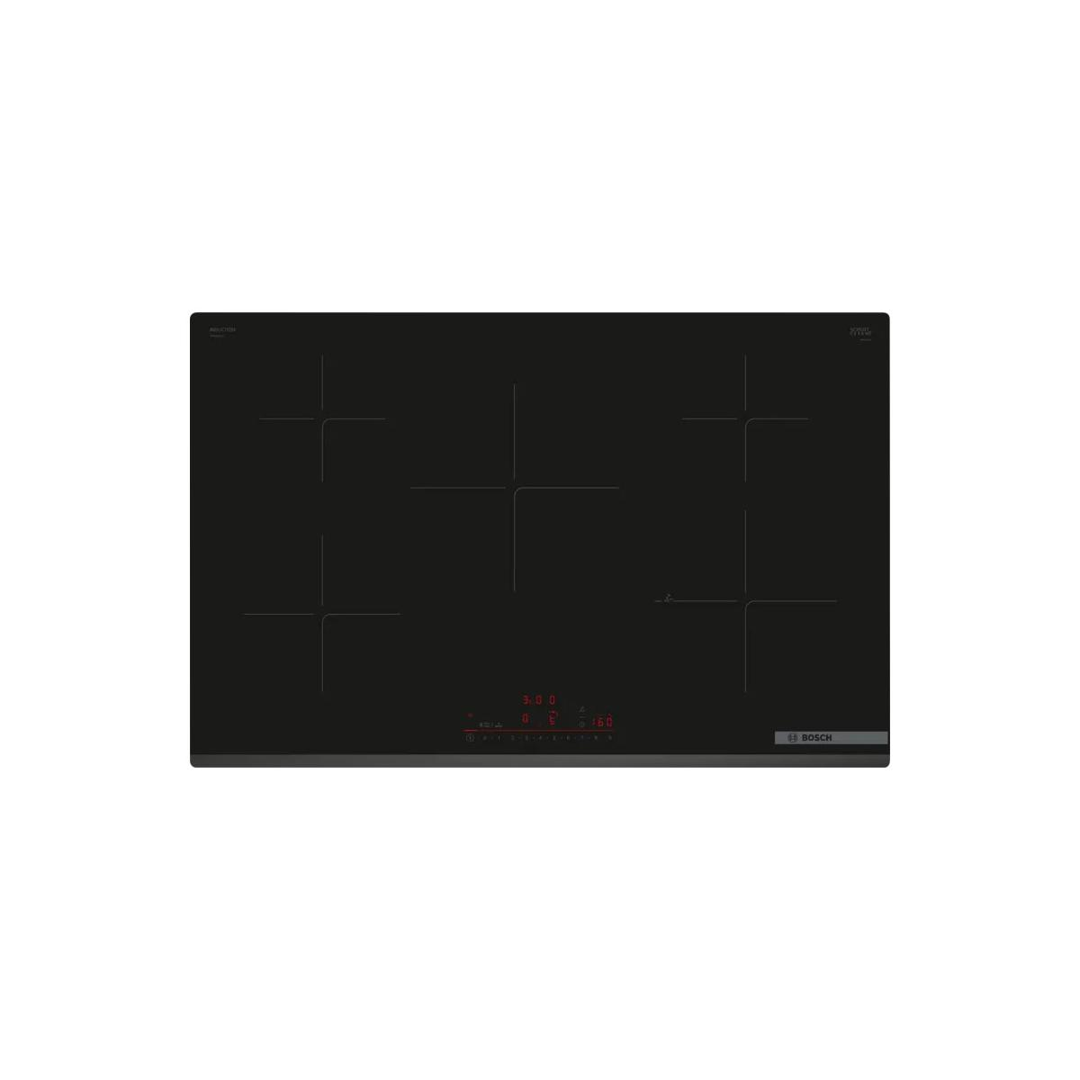 BOSCH Serie 6 PVW831HC1E PIANO COTTURA A INDUZIONE, 5 zone di cotura, dimensioni: L 802 mm, P 522 mm, piano in Vetro float, Nero