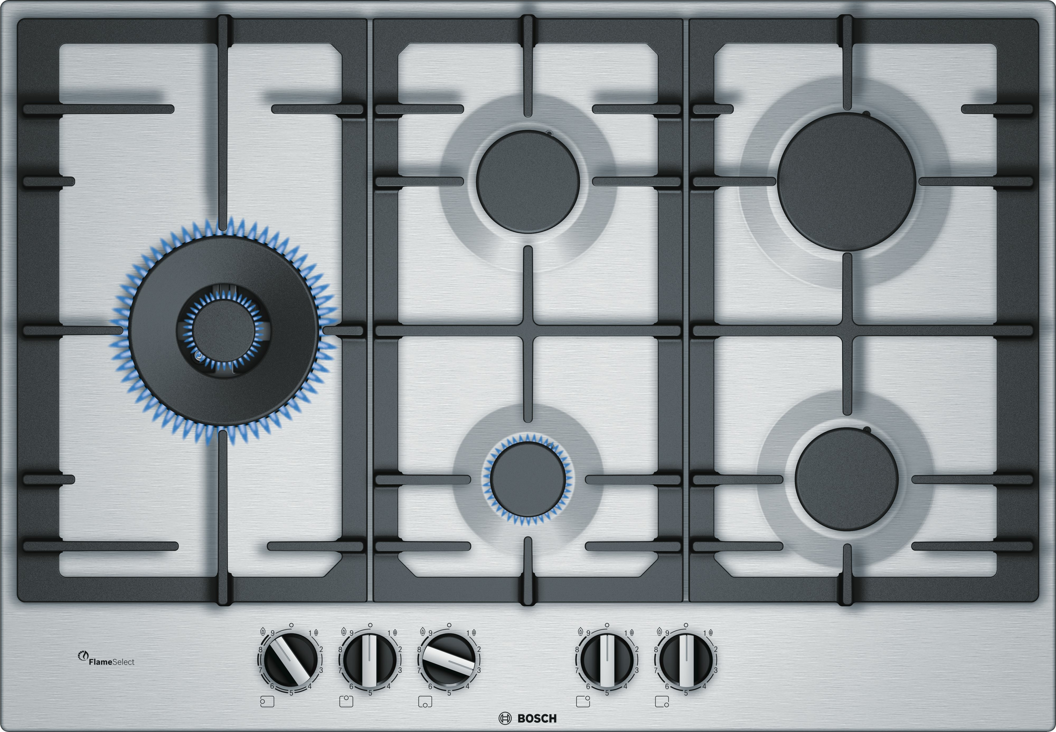BOSCH Serie 6 PCS7A5B90 PIANO COTTURA, 5 zone di cotura, dimensioni: L 750 mm, P 520 mm, piano in Acciaio inossidabile, Acciaio inox