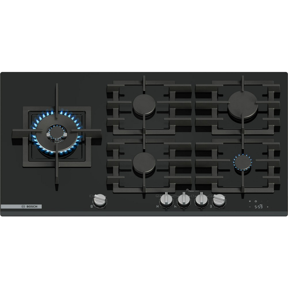 BOSCH Serie 8 PRS9A6H40 PIANO COTTURA A GAS, 0 zone di cottura, dimensioni: L 915 mm, P 520 mm, piano in Vetro float, Nero