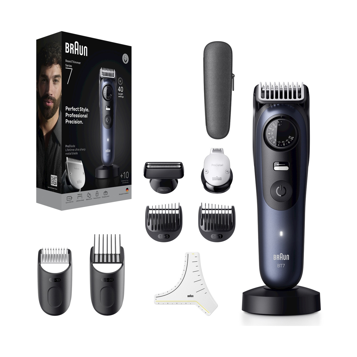 Regolabarba BRAUN SERIES 7, lama ProBlade, tecnologia AutoSense, 40 impostazioni di lunghezza a intervalli di 0,5 mm, rifinitori di precisione, 1 stencil per barba, batteria di lunga durata
