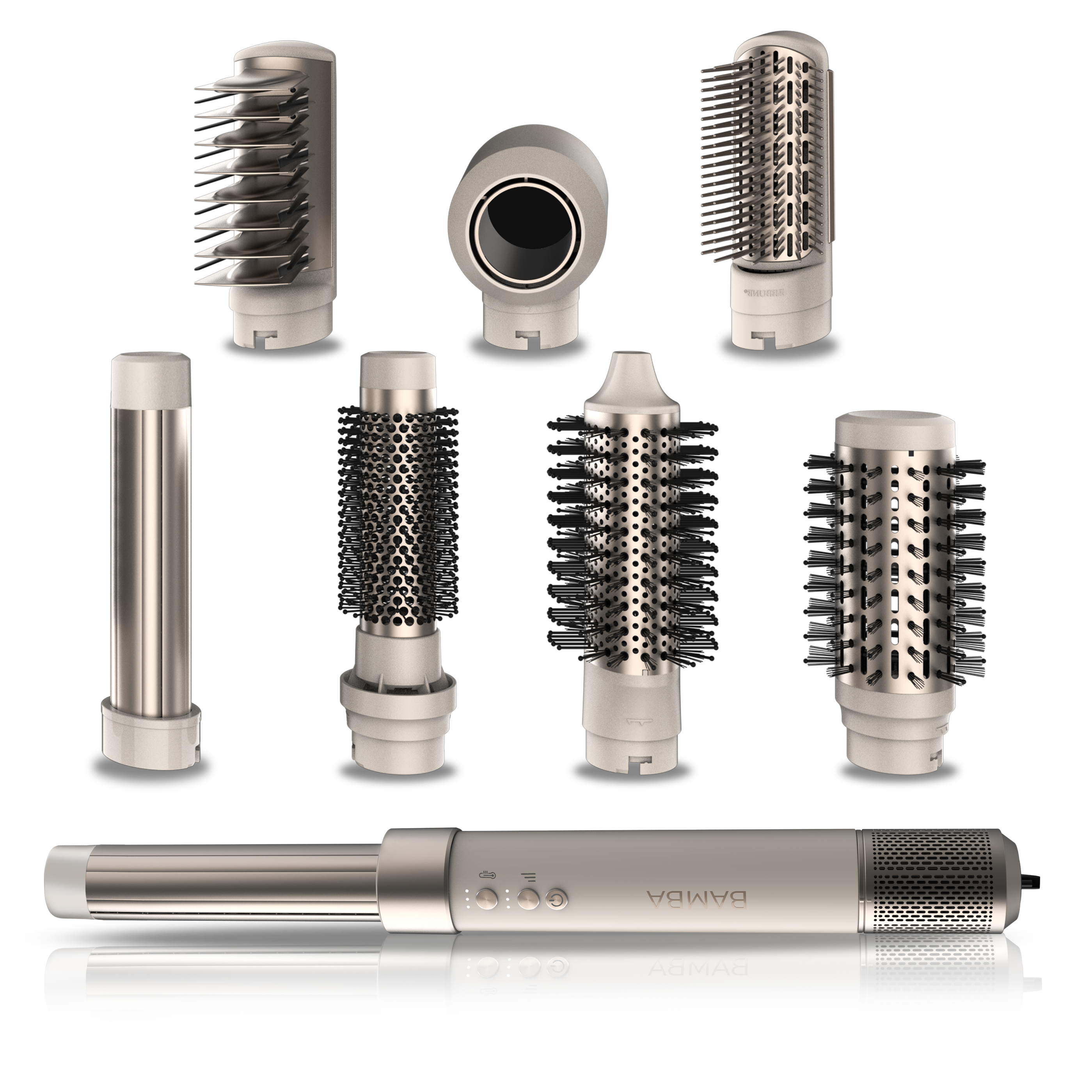 8 teste: asciugatrice, spazzole da 33 mm, 40 mm e 70 mm, 2 pettini, 2 cilindri arricciatori (destro e sinistro), Manuale istruzioni, Prodotto