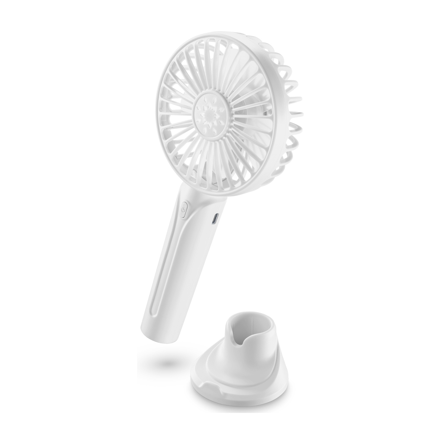 Porta microUSB per caricare il ventilatore; 3 velocità; Base con supporto per Smartphone; 3h di autonomia.