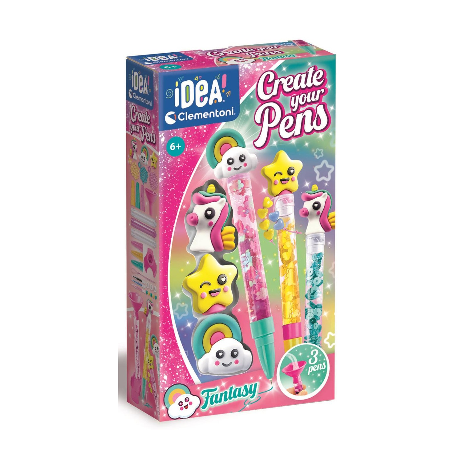 Un pratico e ricco kit composto da: 3 penne, 4 inchiostri di diversi colori 3 personaggi e tutti gli strumenti per realizzarle.