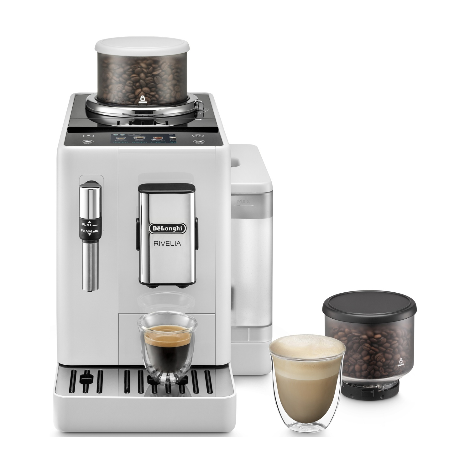 Macchina Automatica per Caffè DE'LONGHI Rivelia EXAM440.35.W, Cappuccinatore Manuale Classico, 2 portachicchi intercambiabili, 8 bevande dirette, Display Touch, 19 bar, 1450 W, Bianco