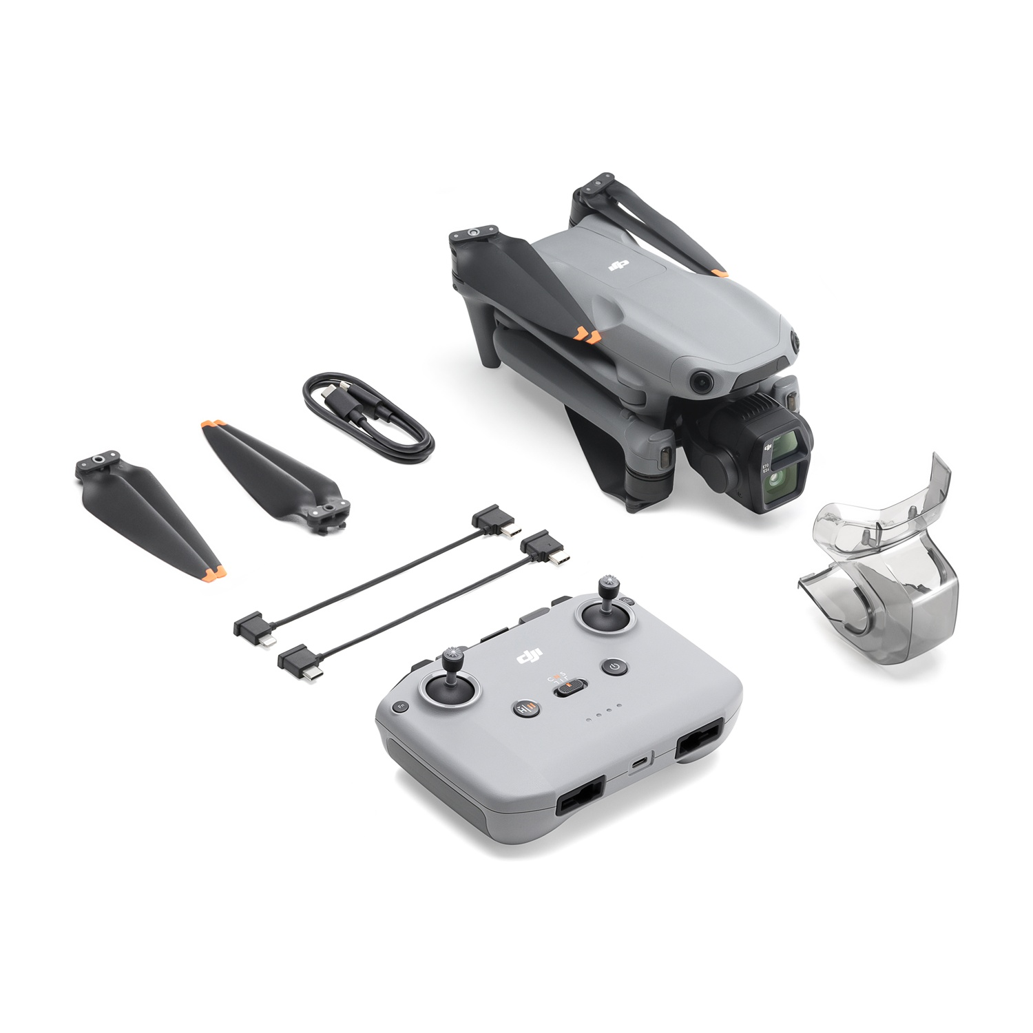 DRONE, Radiocomando DJI RC-N3; Cavo per radiocomando DJI RC-N3/N2/N1 (connettore USB-C); Cavo per radiocomando DJI RC-N3/N2/N1 (connettore Lightning); Batteria di volo intelligente DJI Air 3S; Eliche silenziose di ricambio (coppia) per DJI Air 3 Series; Protezione dello stabilizzatore per DJI Air 3S; Documentazione (Guida rapida e Linee guida sulla sicurezza); Cavo PD da Type-C a Type-C.