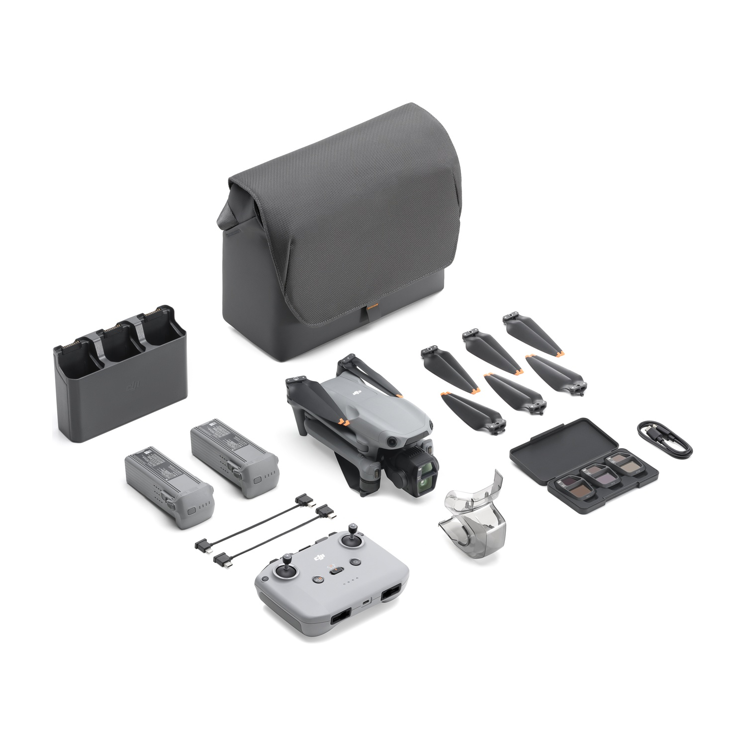 DRONE, 1x Radiocomando DJI RC-N3; 1x Cavo per radiocomando DJI RC-N3/N2/N1 (connettore USB-C); 1x Cavo per radiocomando DJI RC-N3/N2/N1 (connettore Lightning); 3x Batteria di volo intelligente DJI Air 3S; 3x Eliche silenziose di ricambio (coppia) per DJI Air 3 Series; 1x Protezione dello stabilizzatore per DJI Air 3S; 1x Documentazione (Guida rapida e Linee guida sulla sicurezza); 1x Cavo PD da Type-C a Type-C; 1x Borsa a tracolla DJI; 1x Set di filtri ND per DJI Air 3S (ND8/32/128); 1x Hub di ricarica per batterie DJI Air 3 Series.
