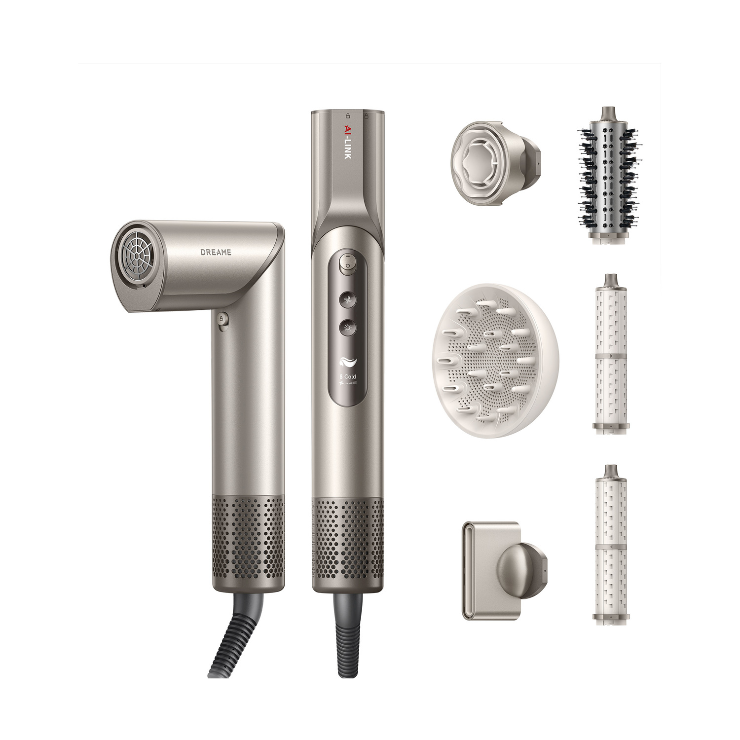 Multi Styler, Bocchetta per lo styling ×1 ; Bocchetta lisciante ×1 ; Diffusore ×1 ; Bocchetta con spazzola ovale ×1 ; Bocchetta arricciacapelli ×2 ; Manuale d’uso ×1 ; Guida all’uso ×1; Ferro incluso: No