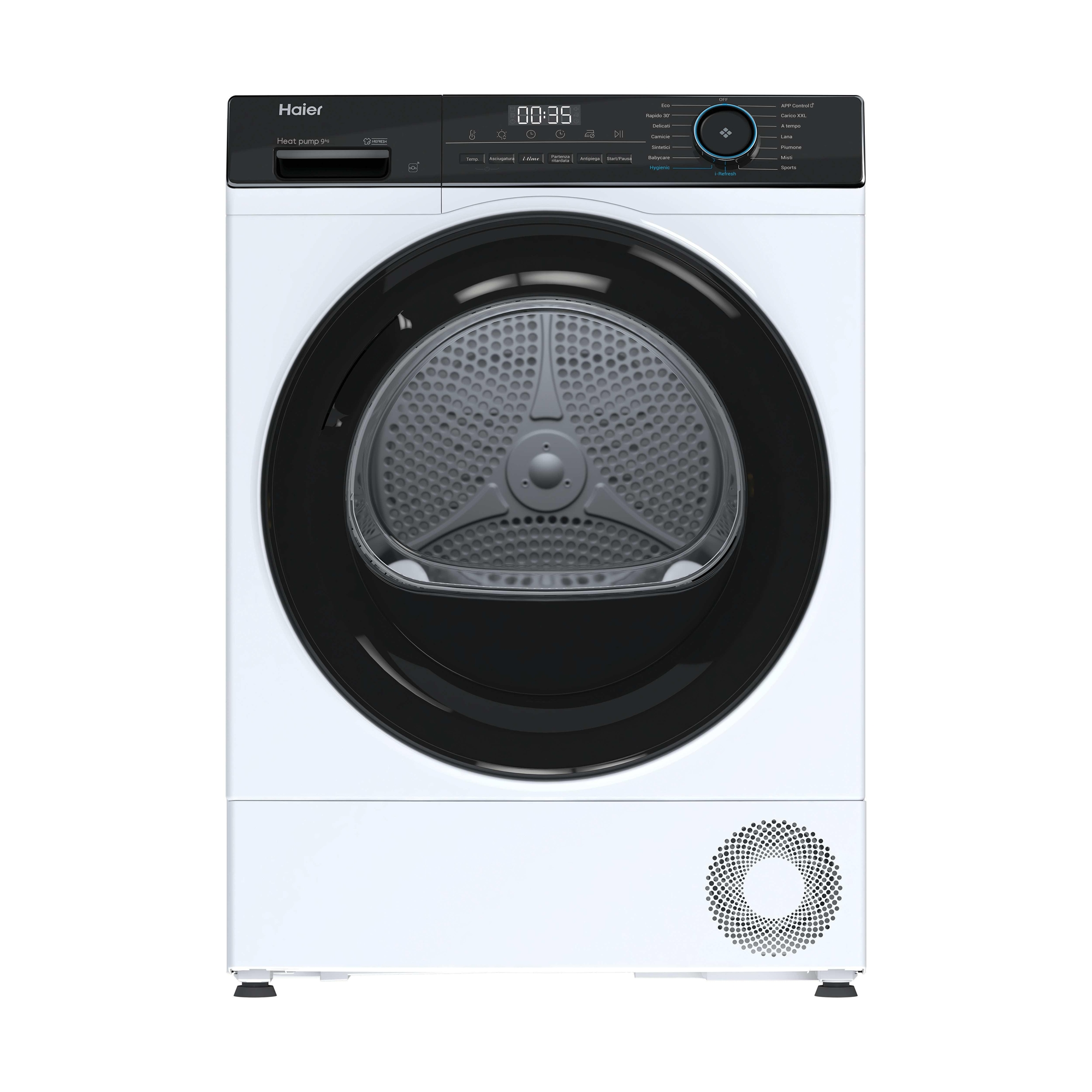 Asciugatrice HAIER HD90-B959E-IT, a pompa di calore, 9 Kg, profondità 65,2 cm, funzione refresh Eco, App Control, Classe B