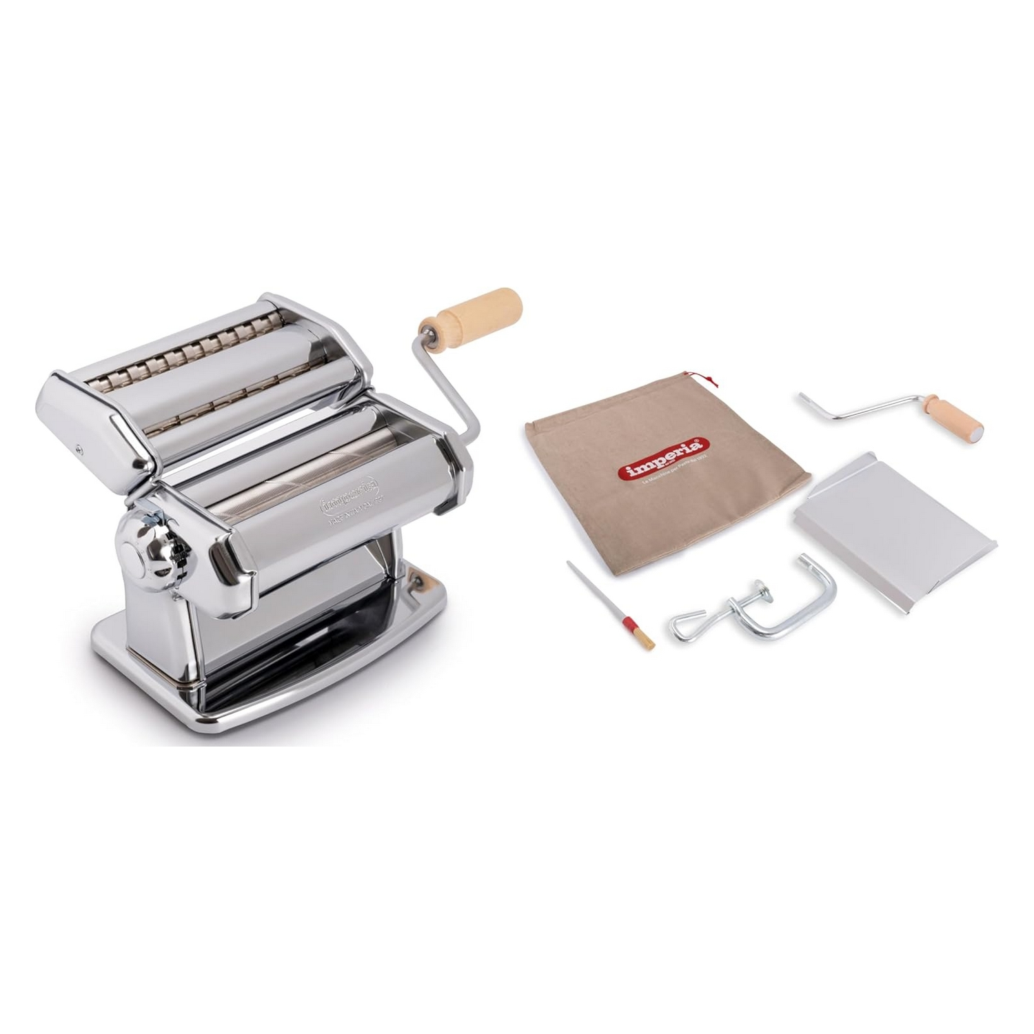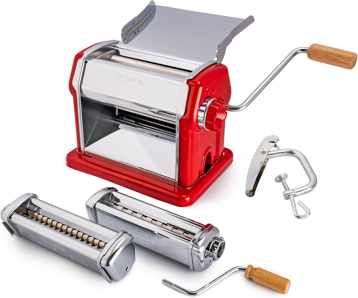 macchina per pasta Imperia iPasta T. 6.5/12 mm Ruvida, manovella manuale, morsetto per fissaggio al piano di lavoro, mini mattarello in legno di faggio massello, raschietto in legno di faggio massello, istruzioni d'uso