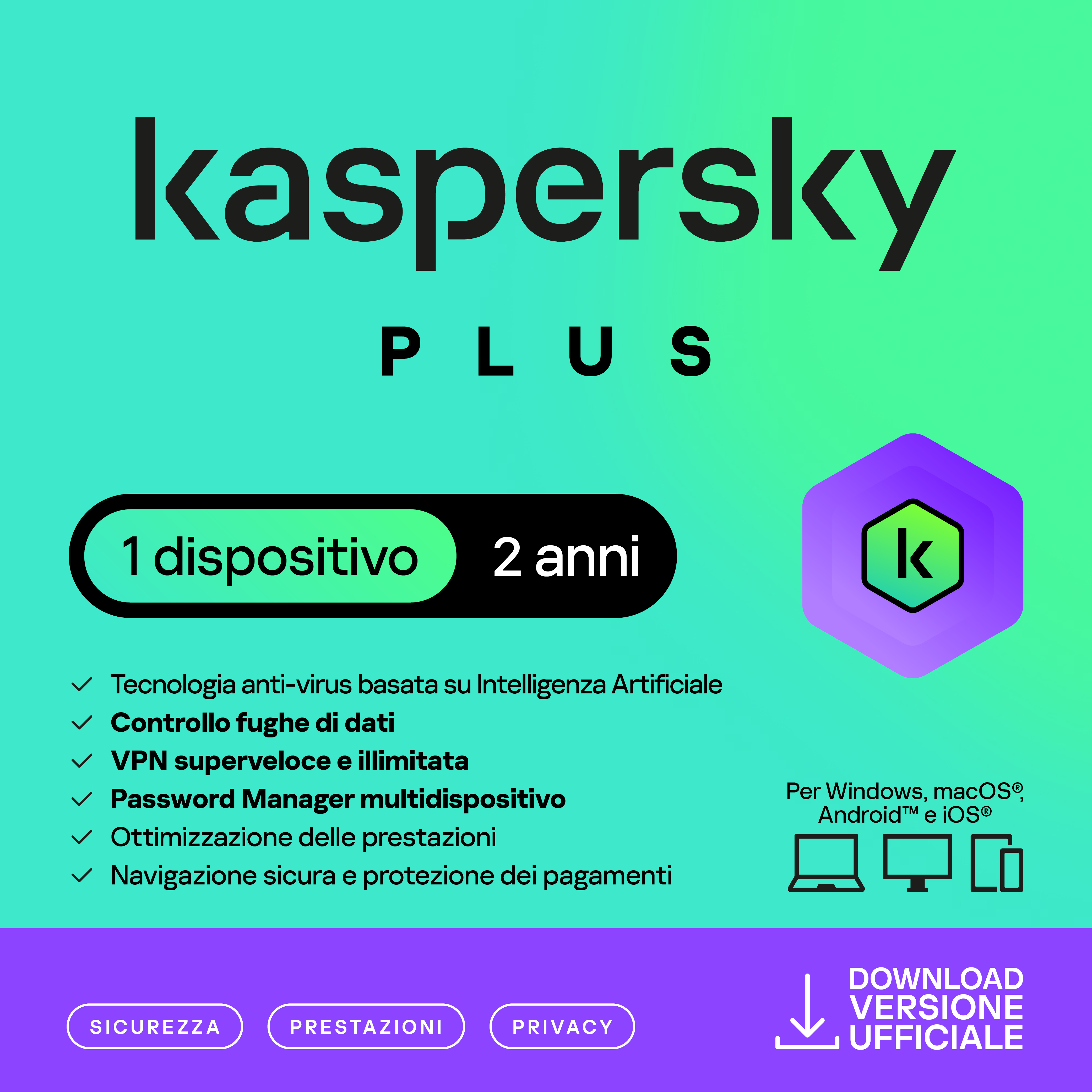 KASPERSKY ANTIVIRUS Versione Plus - Software PC, Tablet, Smartphone – 1 Device - Abbonamento 2 Anni