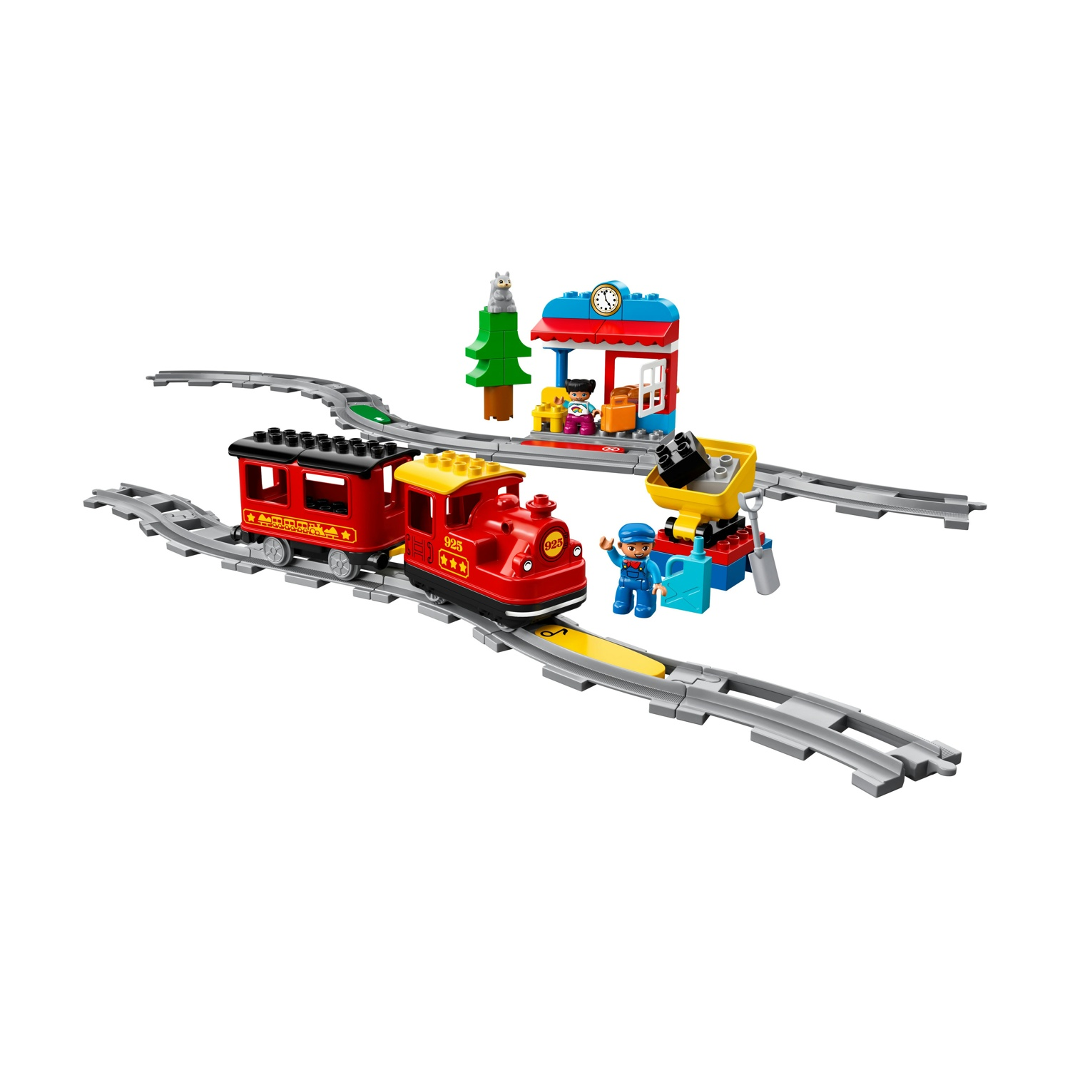 Contiene una locomotiva Push & Go con luci e suoni, carrozza passeggeri, 5 mattoncini multifunzione codificati a colori, stazione ferroviaria, carro del carbone ribaltabile, albero e 16 binari.