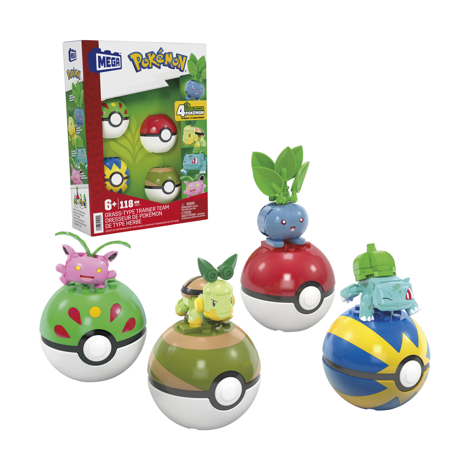 Include 4 Pokémon di Tipo Erba costruibili e snodati con 4 sfere Poké con perni; Include i Pokémon di Tipo Erba Bulbasaur, Turtwig, Hoppip e Oddish.