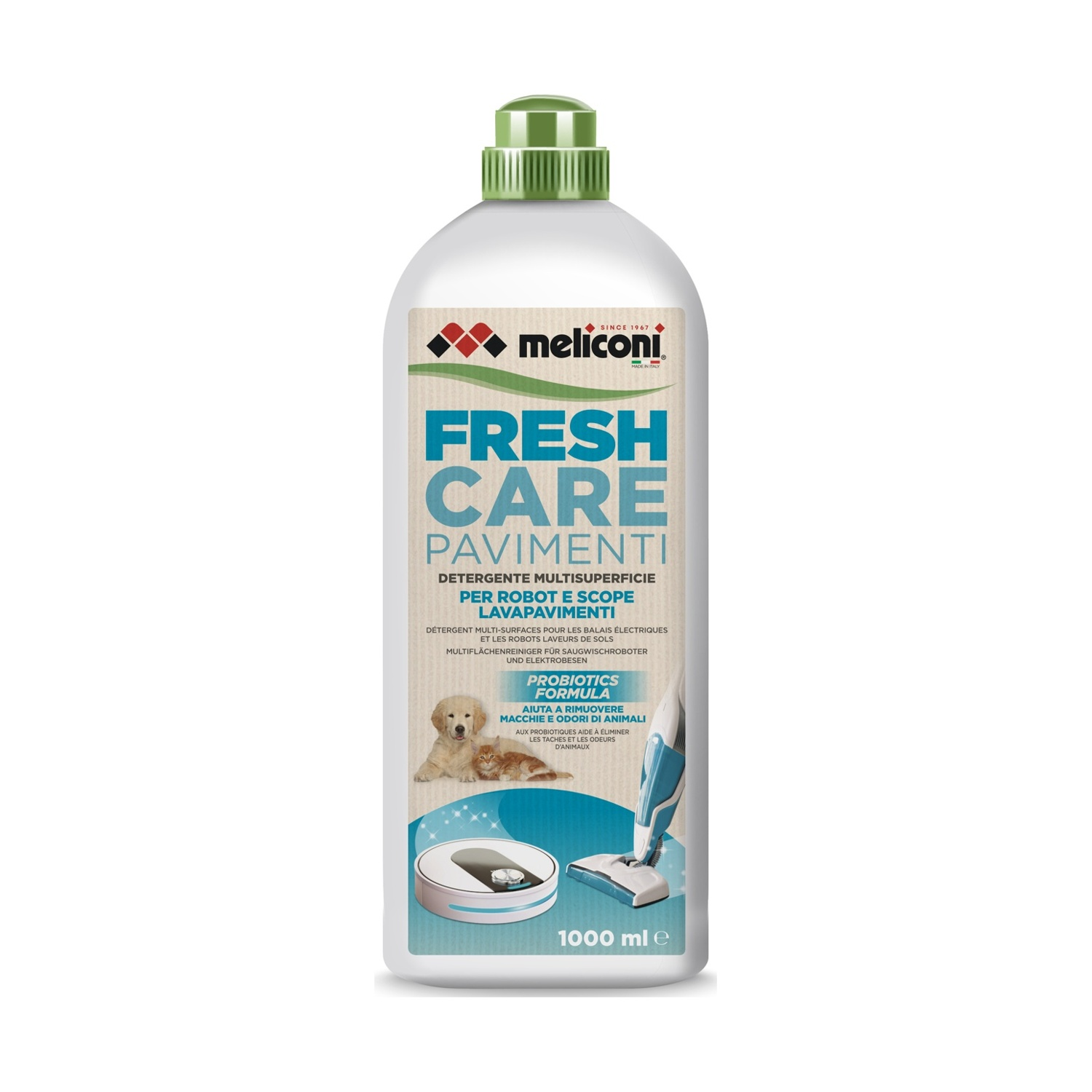 Detergente pavimenti per scope elettriche e robot di tutte le marche, multisuperficie 1L, pulito efficace nel rispetto dell'ambiente. Aiuta a rimuovere macchie e odori di animali domestici con formula probiotica.
