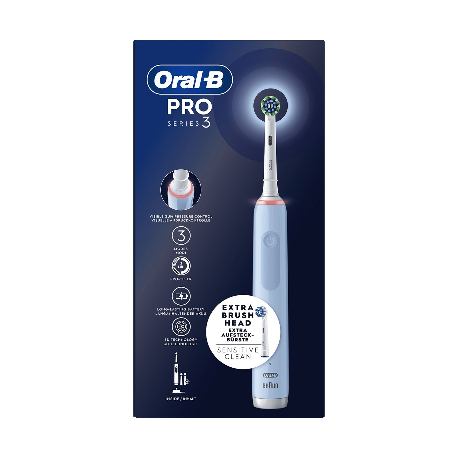 Spazzolino elettrico ORAL-B Pro SERIES 3 3700, con 3 testine di ricambio, 3 programmi, Azzurro