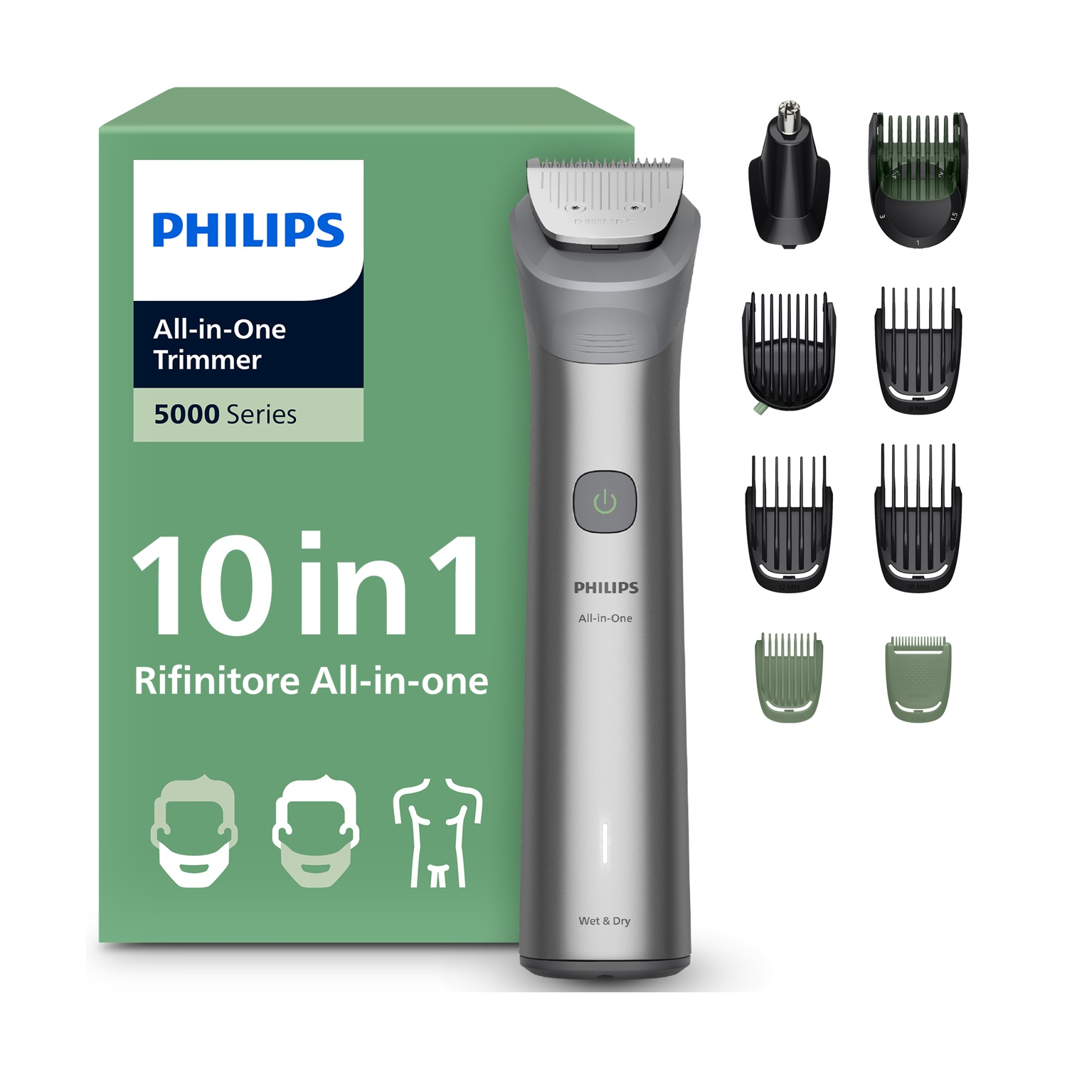 Regolabarba e capelli, Strumenti per lo styling: Rifinitore in acciaio; Rifinitore per naso e orecchie; Rasoio per il corpo con sistema di protezione della pelle; 2 pettini per barba di 3 giorni; Pettine regolabile da 3-7 mm; 3 pettini per capelli; 1 pettine per il corpo; Custodia morbida; Spazzolina per pulizia; USB-A.