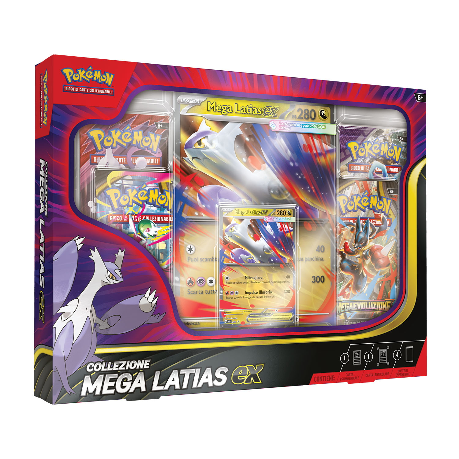 1 carta promozionale olografica di Mega Latias-ex, 1 carta promozionale lenticolare gigante di Mega Latias-ex, 4 buste di espansione del GCC Pokémon.