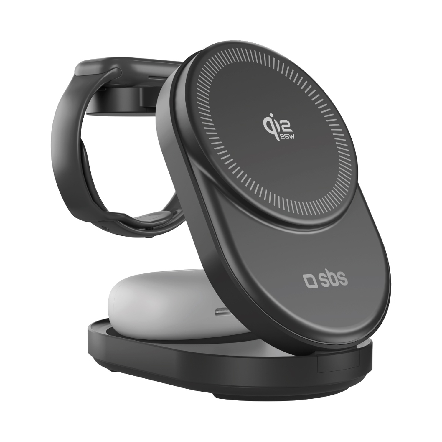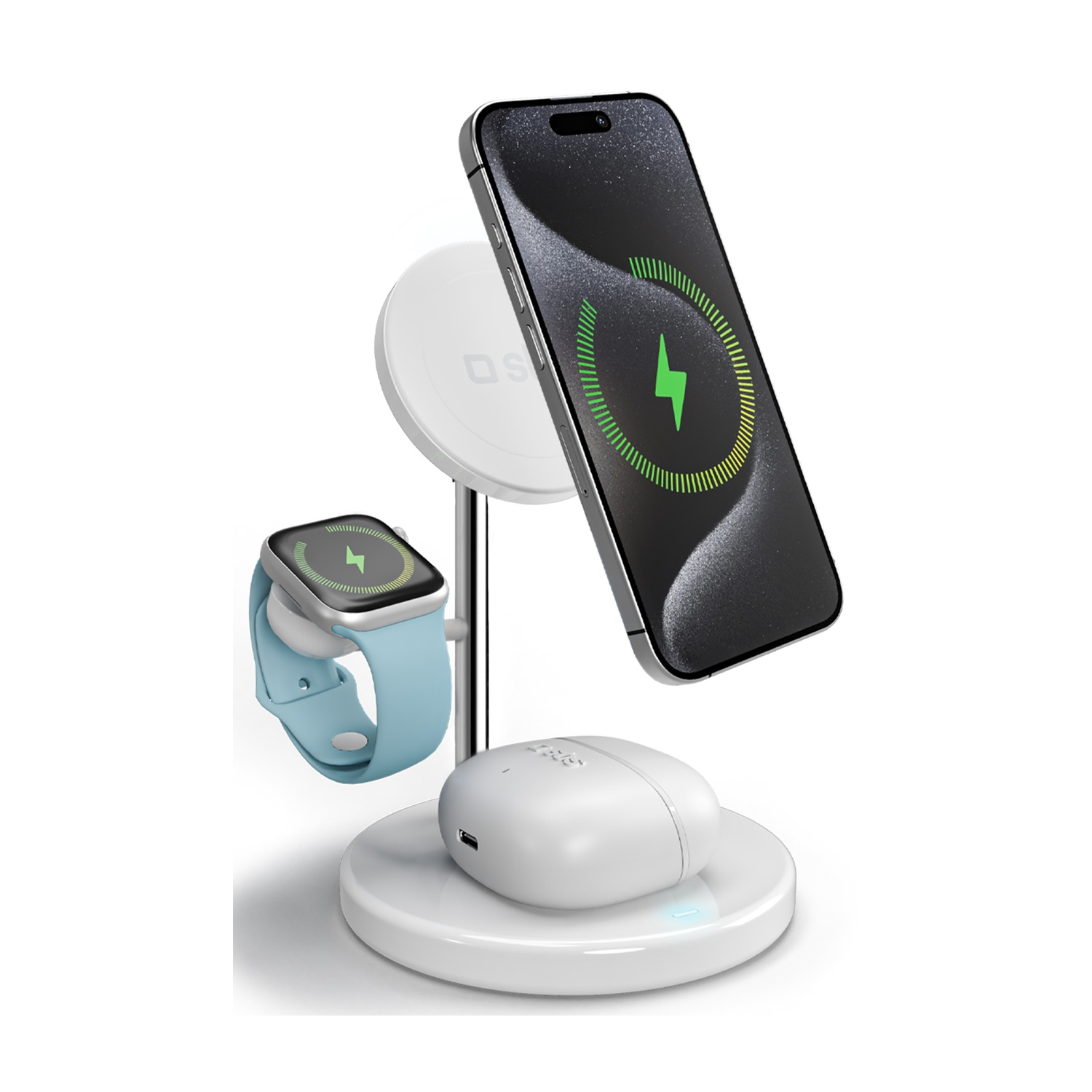 Tecnologia Qi2, 3 postazioni di carica per cellulari, Apple Watch e auricolari wireless.