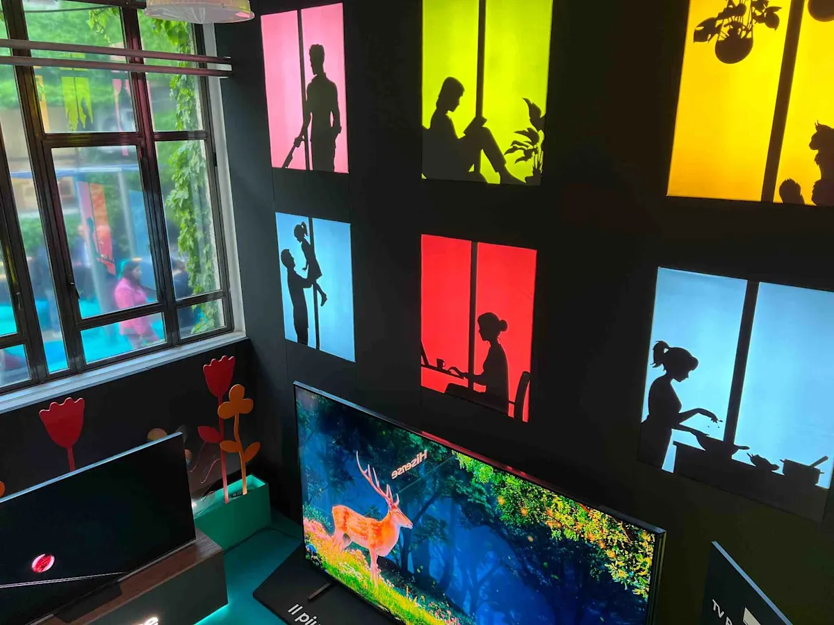 Uno spazio colorato, diviso in quattro momenti distinti. Si inizia da The Entrance. Qui il visitatore riceve due strumenti: una matita e una mappa. Diventa parte attiva dell'esplorazione, con il preciso compito di trovare parole nascoste durante il percorso. Nella Central Plaza veniamo catapultati in una piazza urbana, un Distretto con elementi outdoor - come una sorta di parco - dove muoversi liberamente. Si prosegue poi in un ambiente più intimo e raccolto, l’Inner Court, dove dalle finestre colorate, possiamo intravedere vari momenti di vita quotidiana: un padre che gioca col figlio neonato, una ragazza intenta a lavorare alla scrivania, chi prepara la cena. Qui ci accolgono anche i primi prodotti Hisense dell’esposizione: una TV da 116 pollici con tecnologia RGB MiniLED, dove troviamo la massima espressione del colore, e l’HI Prime, un sistema che connette tutte le stanze dell’ecosistema animate grazie alla stessa energia invisibile.
