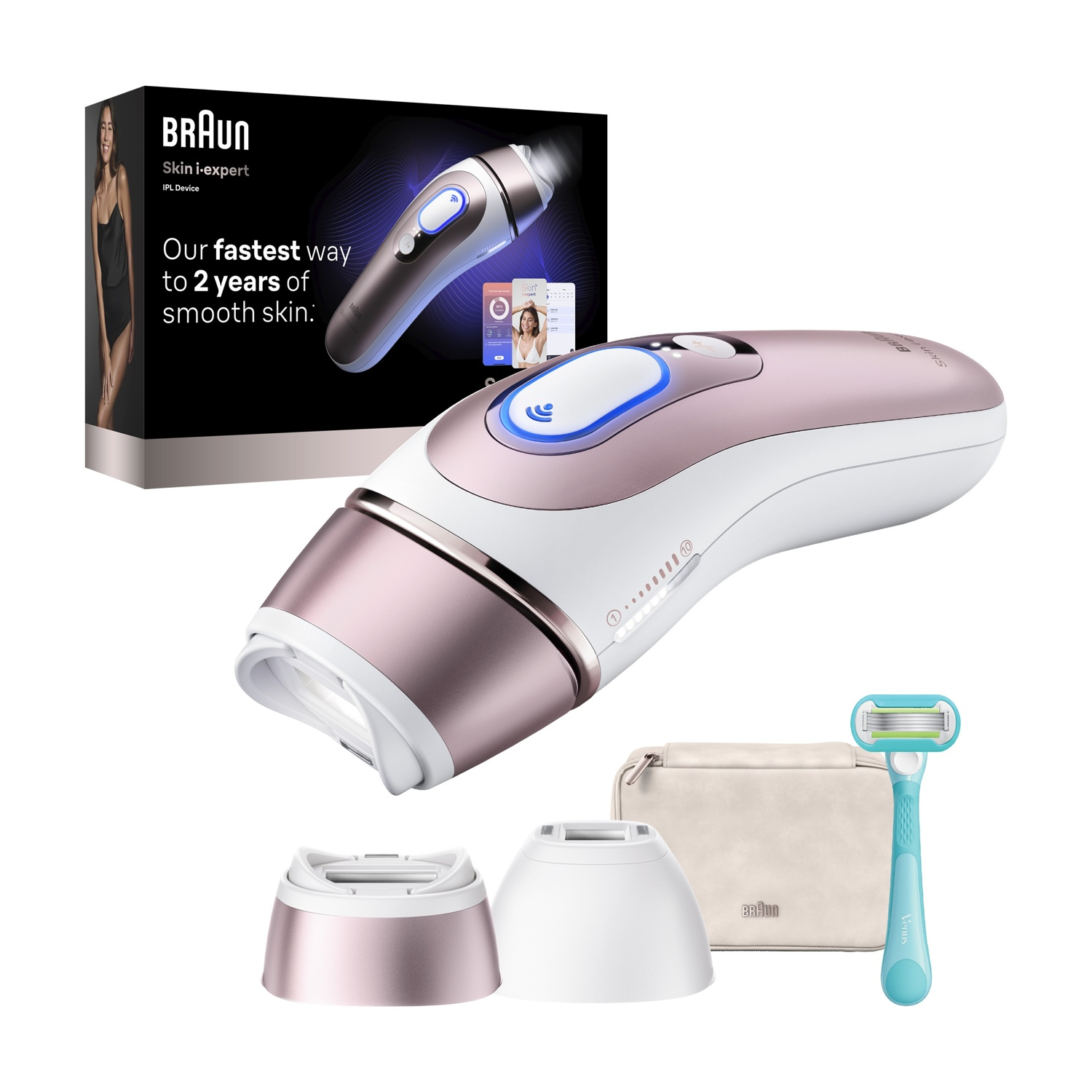 EPILATORE LUCE PULSATA, Testina standard; Testina di precisione; Rasoio Venus Swirl Extra Smooth; Custodia di bellezza.