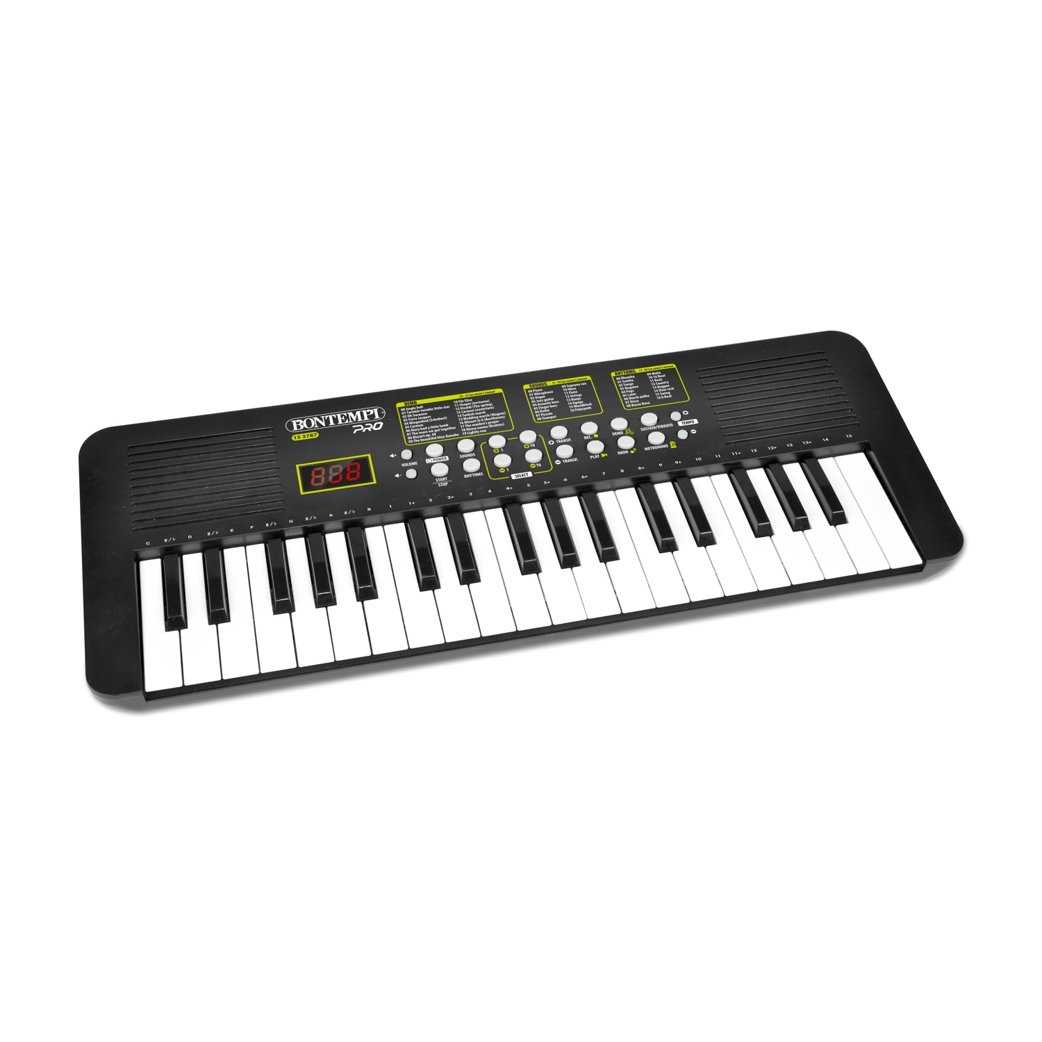 Concertino; Tastiera 25 tasti passo medio (DO-DO); 3 suoni; Transposer di ottava; Polifonia: 4 note; Controllo del volume; Spegnimento automatico; Etichetta pentagramma