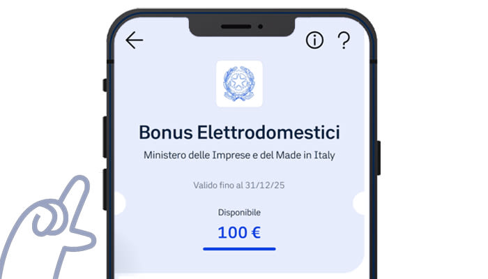 Tramite generazione di un buono su App IO puoi usufruire di uno sconto fino al 30% del valore di acquisto di un elettrodomestico per nucleo familiare, per un massimo di 100 € (o 200 € in caso di ISEE inferiore a 25.000 €).