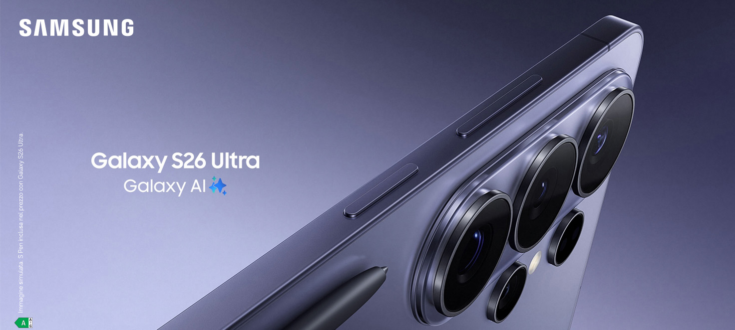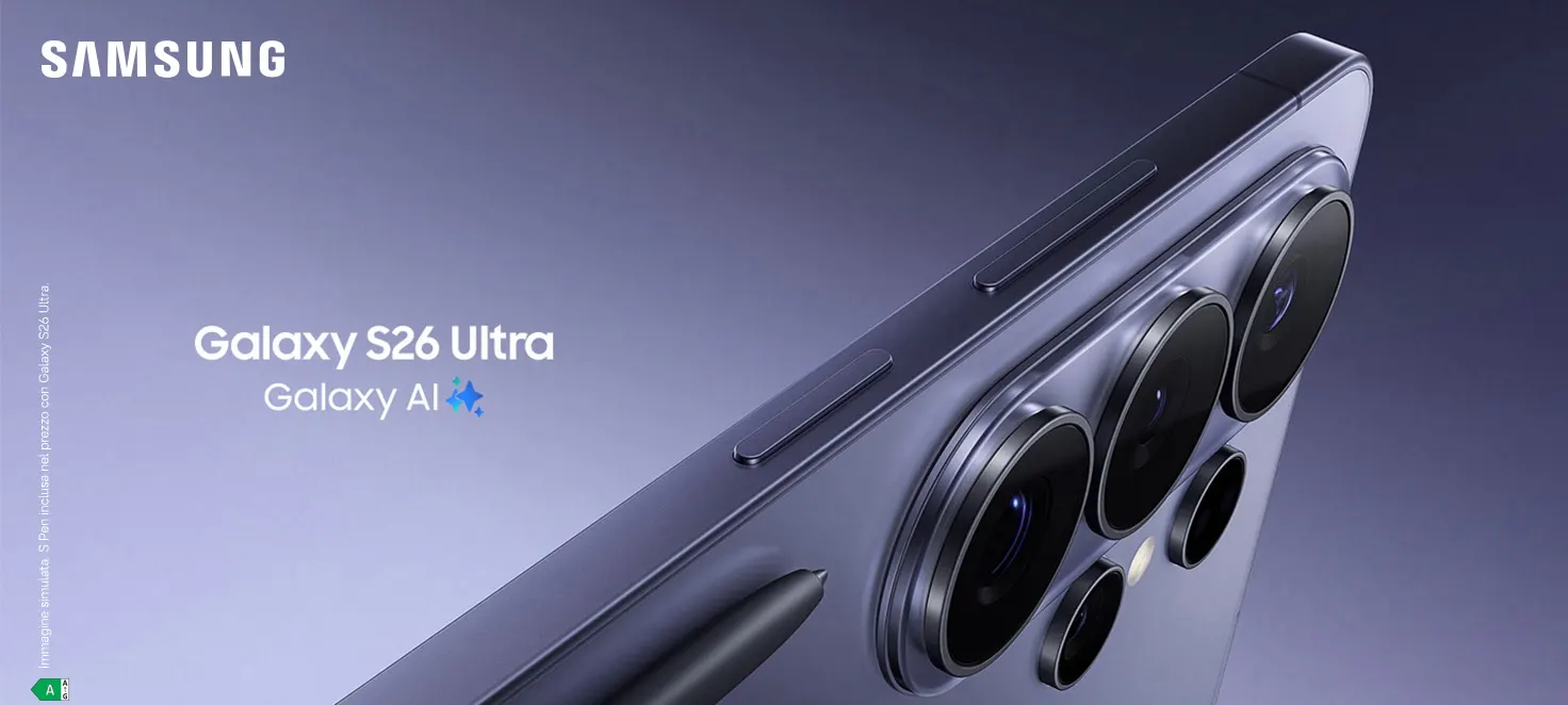 FINANZIAMENTO TASSO ZERO 20 RATE PER SAMSUNG Galaxy S26 | S26+ | S26 Ultra A PARTIRE DA 200€ TAN FISSO 0% - TAEG 0%. Messaggio pubblicitario con finalità promozionale. Offerta di credito finalizzato valida dal 25/02/2026 al 5/04/2026 nei negozi MediaWorld e online come da esempio rappresentativo: Prezzo del bene senza permuta 1.499€, TAN fisso 0%, TAEG 0%, in 20 rate da 74,95€, spese e costi accessori azzerati. Importo totale del credito e dovuto dal Consumatore: €1.499. Prezzo del bene a fronte di una permuta di un Samsung Galaxy S25 Ultra 256GB in ottime condizioni €798 TAN fisso 0%, TAEG 0%, in 20 rate da 39,90€, spese e costi accessori azzerati. Importo totale del credito e dovuto dal Consumatore: €798. Decorrenza media prima rata 30 giorni. IEBCC nel punto vendita e online. Salvo approvazione di Findomestic Banca S.p.A. per cui Mediamarket S.p.A. con Socio Unico opera quale intermediario del credito, in esclusiva. Per i titolari di Linea di Credito MediaWorld Smart Line è possibile aderire a questa offerta alle medesime condizioni del credito finalizzato.