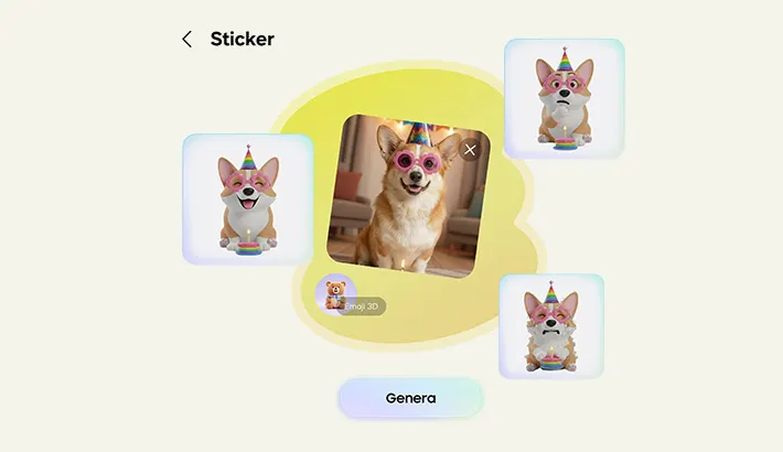 Apri Creative Studio e scopri uno spazio dedicato alla creazione di set di sticker. Fai un mix di schizzi, foto e testi per descrivere la tua idea, e Galaxy AI realizzerà le tue creazioni. Poi, aggiungi il set di sticker alla tastiera o condividilo con i tuoi amici.¹²